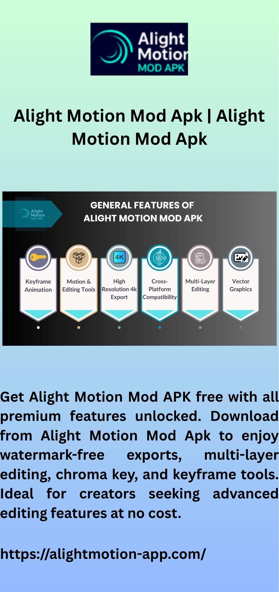 Get Alight Motion Mod APK free with all premium features unlocked. Download from Alight Motion Mod Apk to enjoy watermark-free exports, multi-layer editing, chroma key, and keyframe tools. Ideal for creators seeking advanced editing features at no cost.