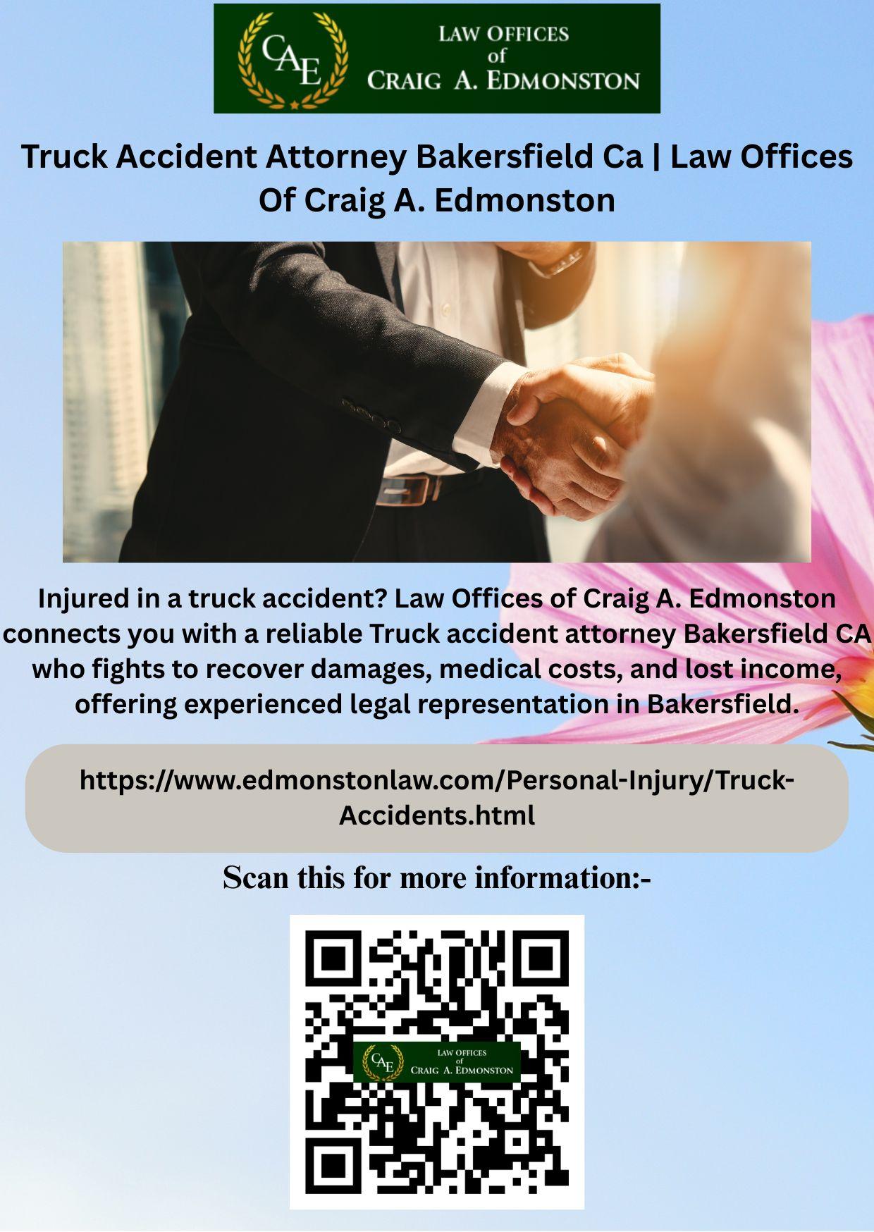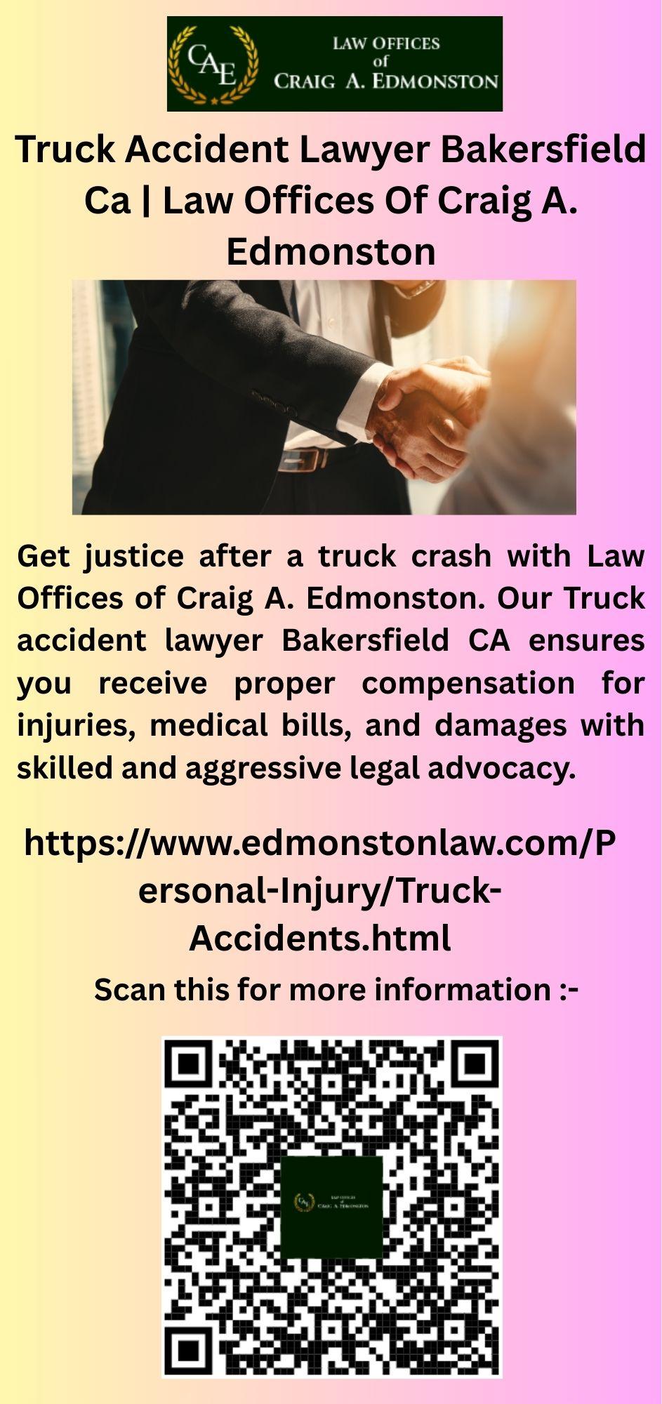 Injured in a truck accident? Law Offices of Craig A. Edmonston connects you with a reliable Truck accident attorney Bakersfield CA who fights to recover damages, medical costs, and lost income, offering experienced legal representation in Bakersfield.