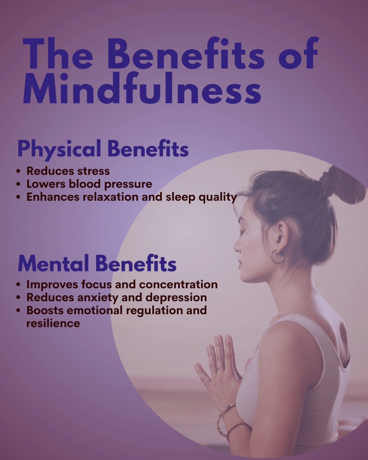 Mindfulness is more than a trend — it’s a powerful practice that supports both physical and mental well-being. This calming visual highlights the key benefits of mindfulness, including reduced stress, lower blood pressure, improved sleep quality, enhanced focus, decreased anxiety, and stronger emotional resilience.