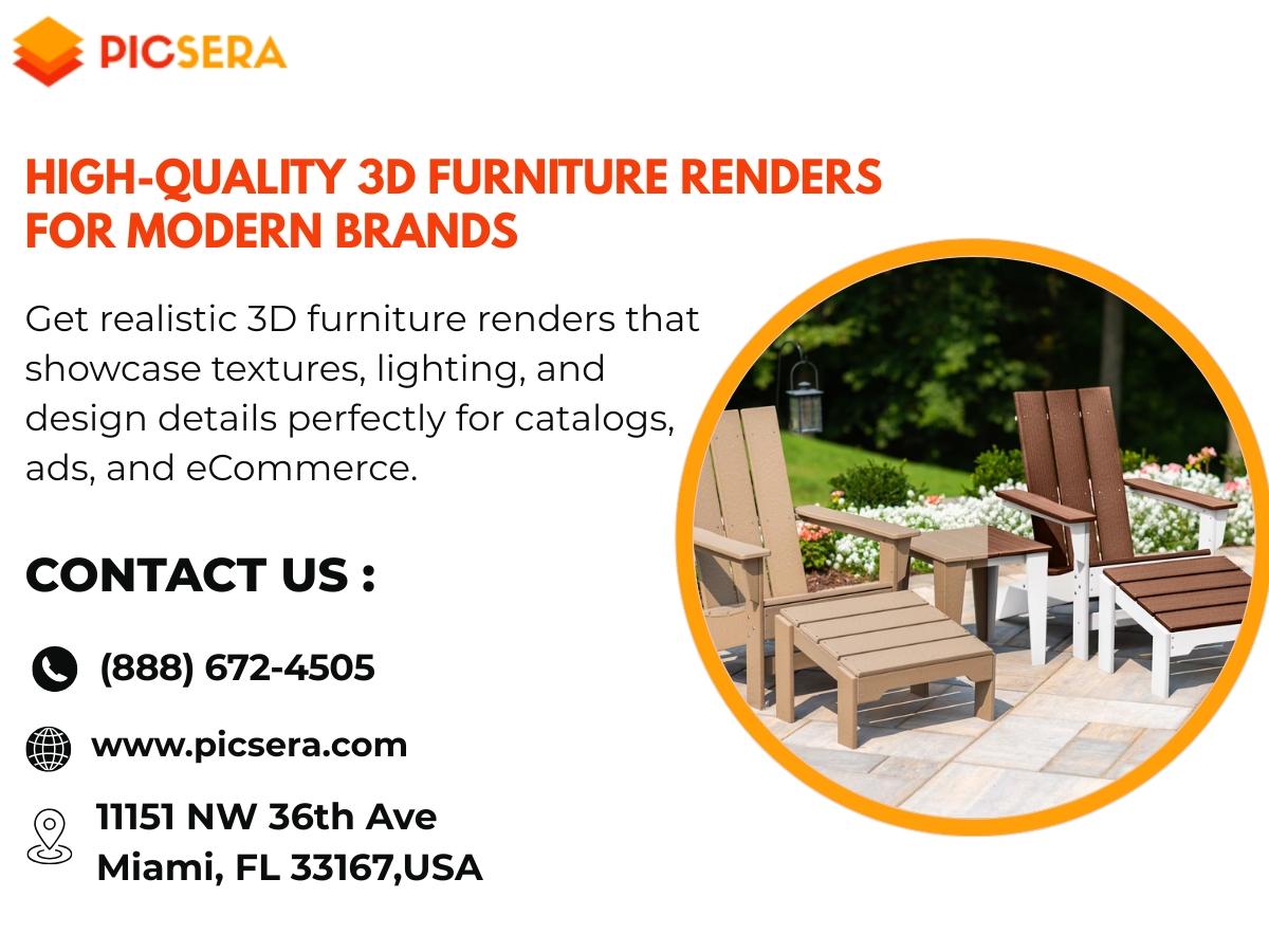 Picsera INC delivers stunning 3D furniture renders that bring your products to life. We create photo-real visuals with accurate materials, shadows, and proportions, helping furniture brands boost engagement, improve conversions, and present designs with confidence across all digital platforms.