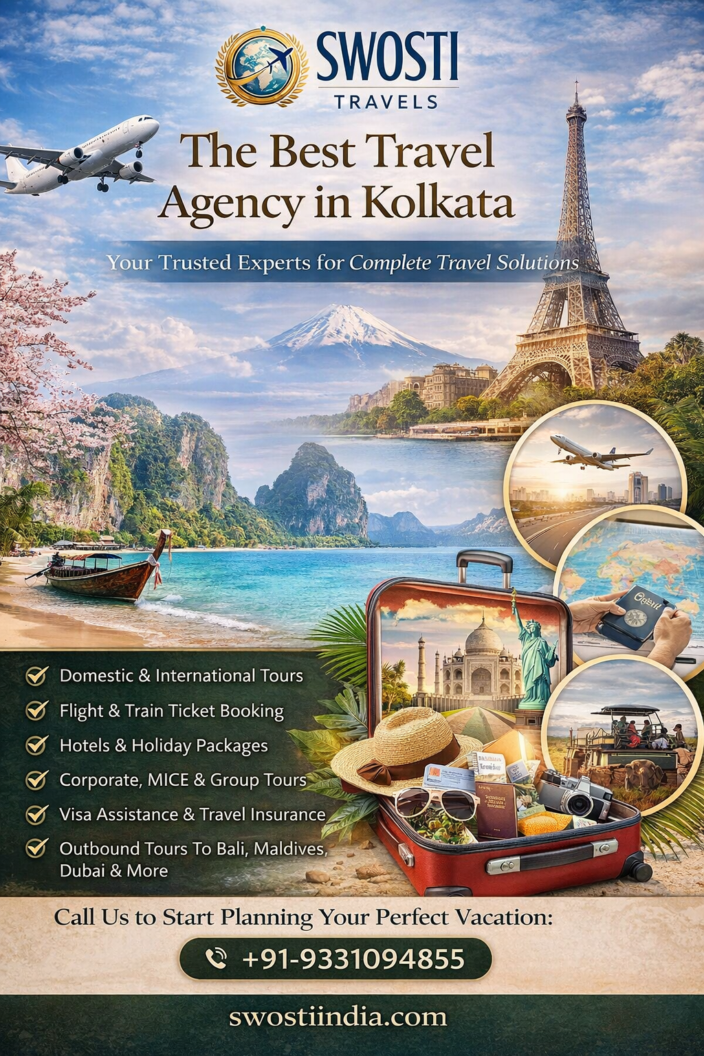 Looking for the best travel agency in Kolkata? Swosti Travels offers domestic and international tour packages, flight booking, hotel reservation, visa assistance, honeymoon tours, corporate travel and customized holiday packages. Call +91-9331094855 for the best travel deals and hassle-free trip planning.