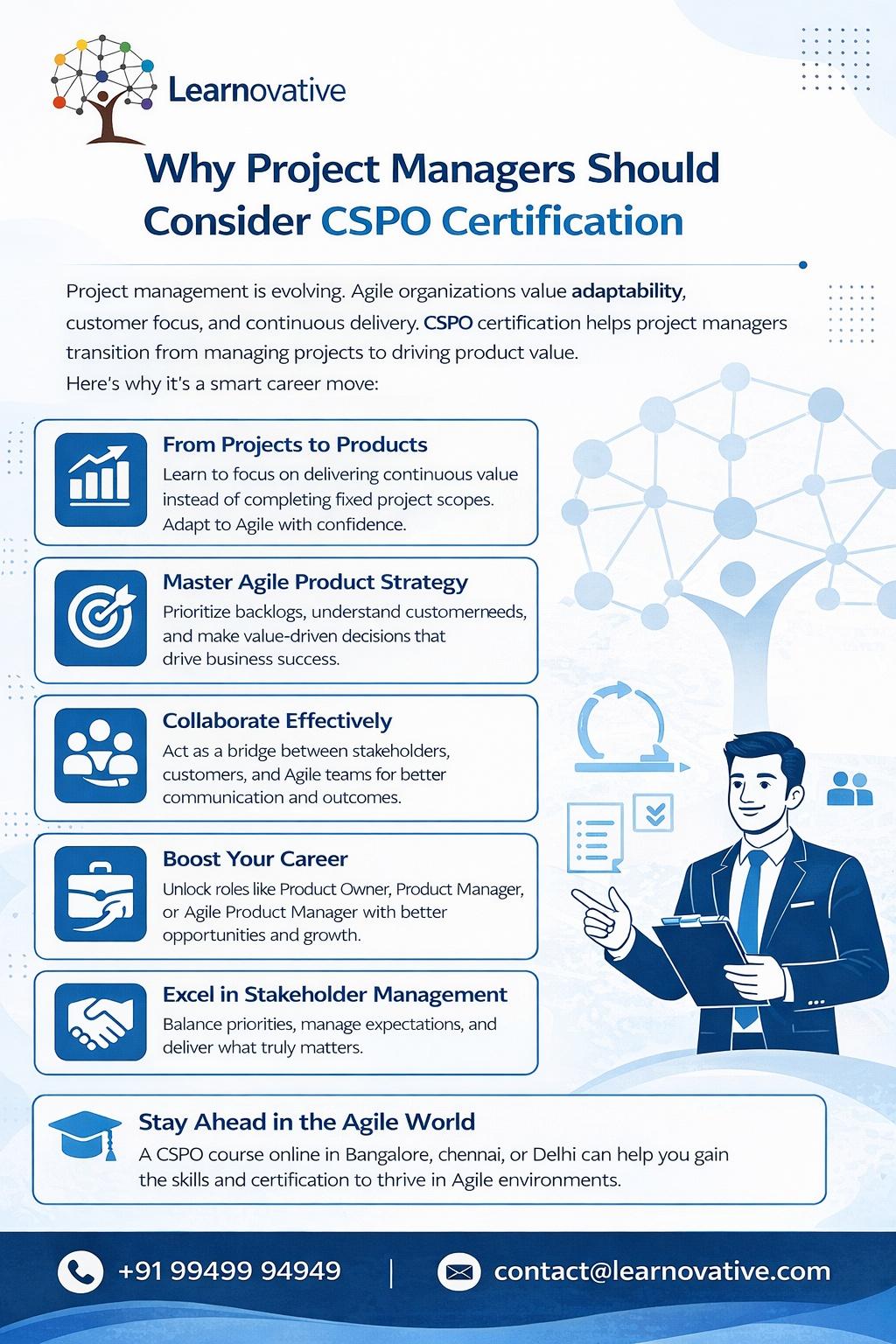 Why Project Managers Should Consider CSPO Certification Project management has changed significantly over the past few years. Traditional project management approaches that focus mainly on timelines. Read more: https://www.learnovative.com/certified-scrum-product-owner-cspo-bangalore/