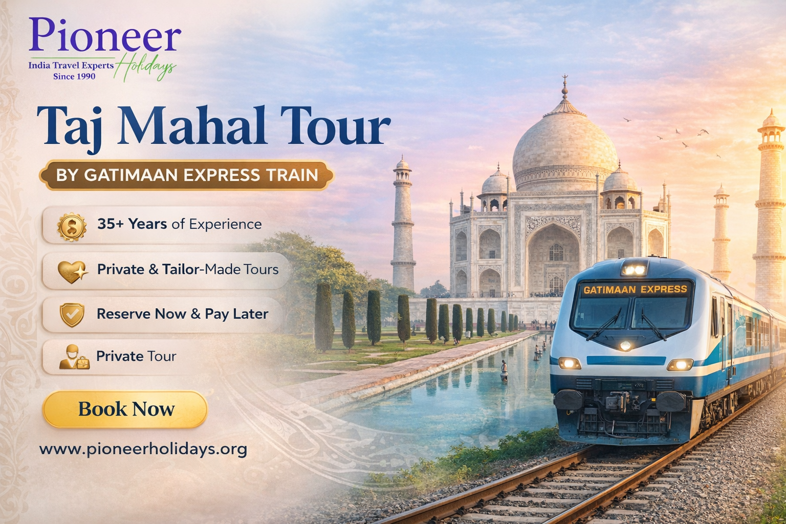 Elevate your itinerary with Taj Mahal tour by Gatimaan Express train. Blitz from Delhi to Agra's symphony of white marble, red forts, and artisan alleys. Includes audio guides, camel rides, and evening returns—crafted for solo explorers, friends, or families seeking premium comfort and profound cultural dives. Explore Package- https://www.pioneerholidays.org/tours/from-delhi-day-trip-to-taj-mahal-and-agra-by-superfast-train
