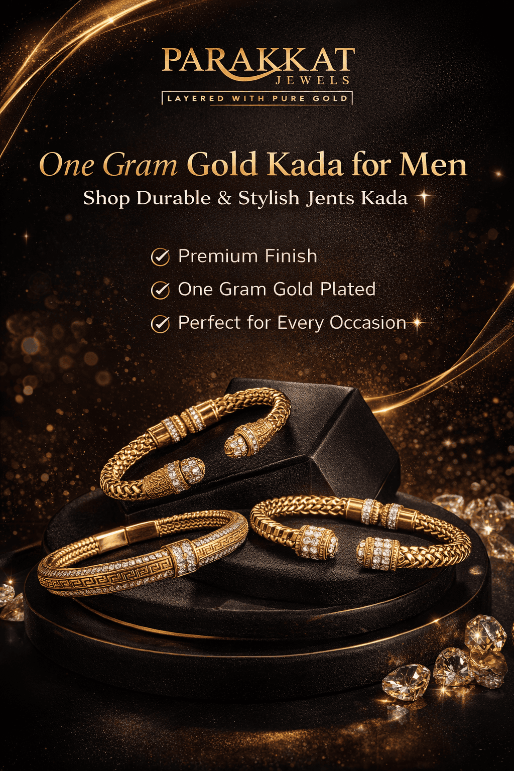 Explore elegant jents kada designs crafted with premium finish. Shop durable and stylish one gram gold plated kada for men perfect for every occasion.