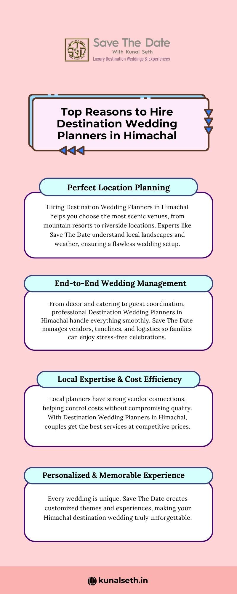 Hiring Destination Wedding Planners in Himachal helps you choose the most scenic venues, from mountain resorts to riverside locations. Experts like Save The Date understand local landscapes and weather, ensuring a flawless wedding setup.