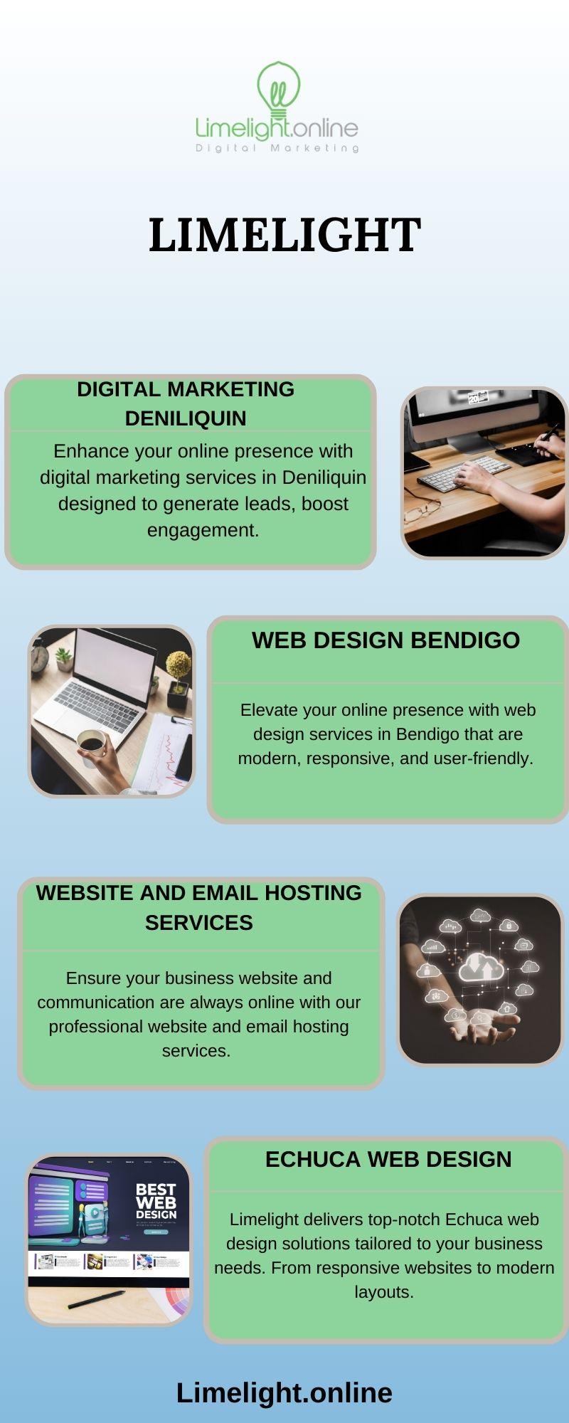 Custom Moama Web Design Services That Combine Creativity, Functionality, and Digital Marketing At Limelight, we specialize in Moama web design that reflects your brand and engages your audience. Our services include website development Echuca Moama, website hosting, and complete website management Echuca Moama to ensure smooth online performance. We also provide email hosting Echuca Moama, effective digital marketing Echuca Moama, and SEO services Echuca Moama to grow your reach. https://limelight.online/