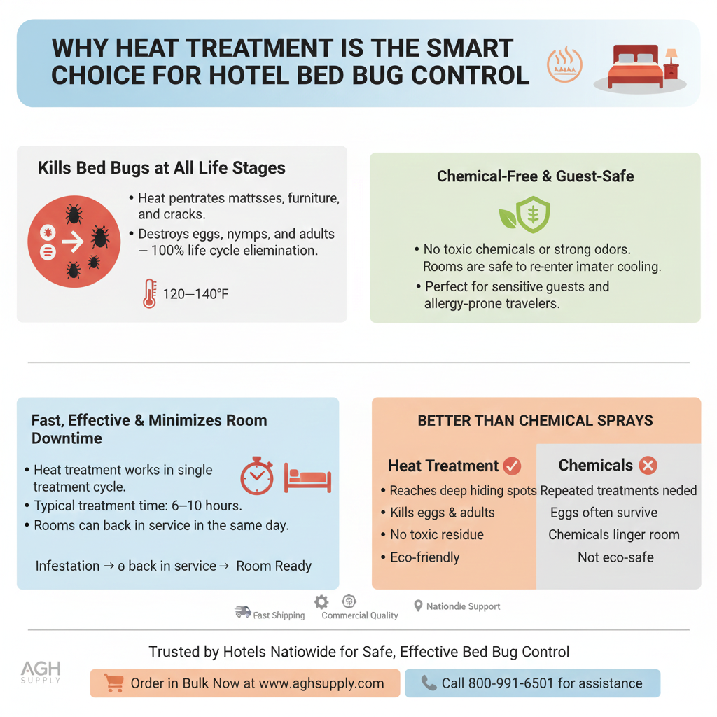 Why Hotels Prefer Heat Treatment for Bed Bug Control Explore why heat treatment beats chemical sprays for hotel bed bug control. See how bed bug heaters kill all life stages safely, fast, and chemical-free.