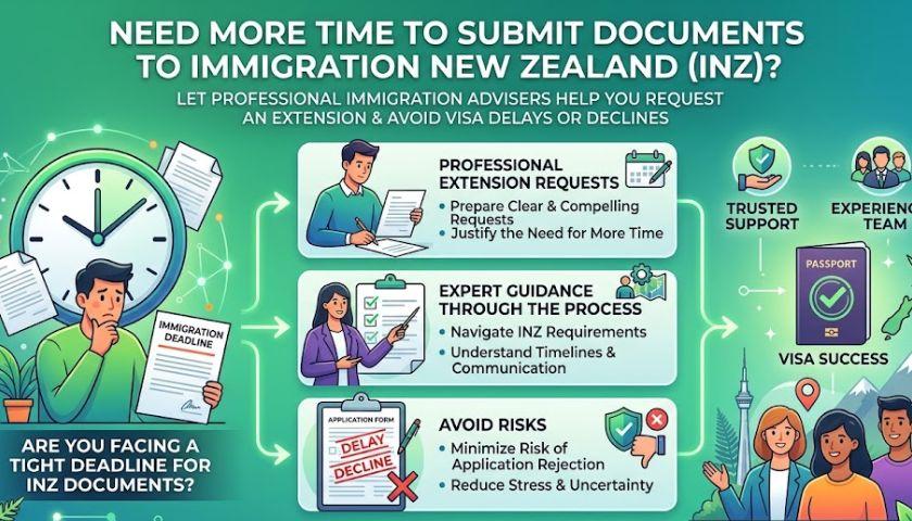 Need more time to submit documents to Immigration New Zealand (INZ)? Let Immigration Advisers New Zealand Ltd help you professionally request an extension and avoid unnecessary visa delays or declines. Our experienced team prepares clear extension requests and guides you through the process. Call today for trusted immigration support.