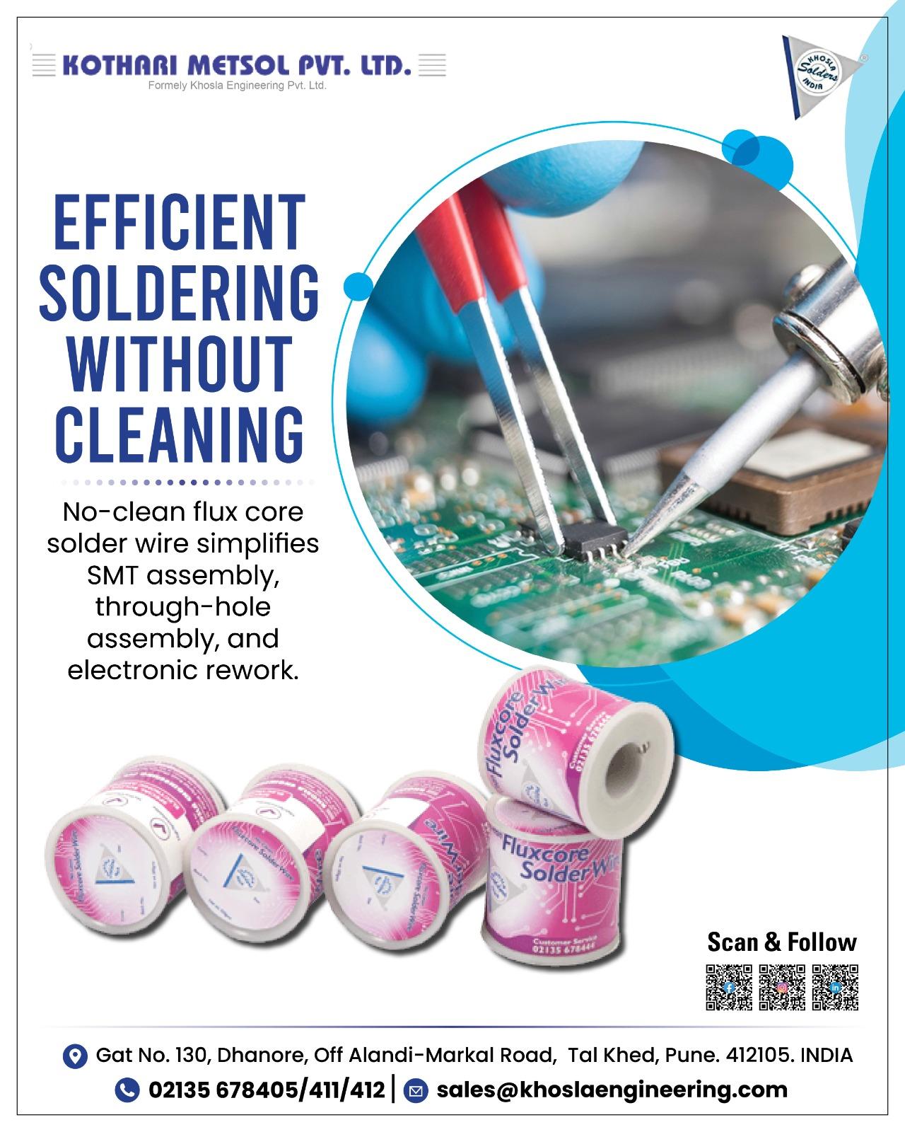 • Improve productivity with high-quality no clean solder wire from Kothari Metsol Pvt. Ltd.. Designed for SMT assembly, through-hole soldering, and electronic rework, it ensures strong joints, reduced residue, and reliable performance in electronic manufacturing.
