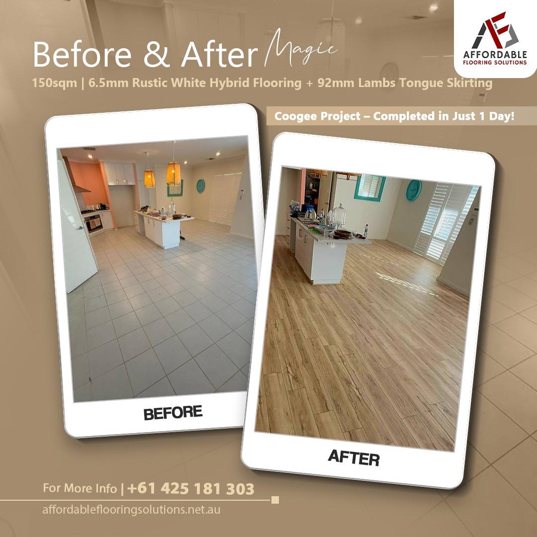 Before & After Transformation in Coogee! 🔨 We smashed out this 150sqm install in just over a day — featuring 6.5mm Painted Bevel Rustic White Hybrid Flooring, 92mm Lambs Tongue Skirting, and full tile prep. The result? A bright, modern space with flawless detail and style that lasts. ✨ Another happy client, another standout finish! https://affordableflooringsolutions.net.au/ #HybridFlooring #CoogeeHomes #BeforeAndAfter